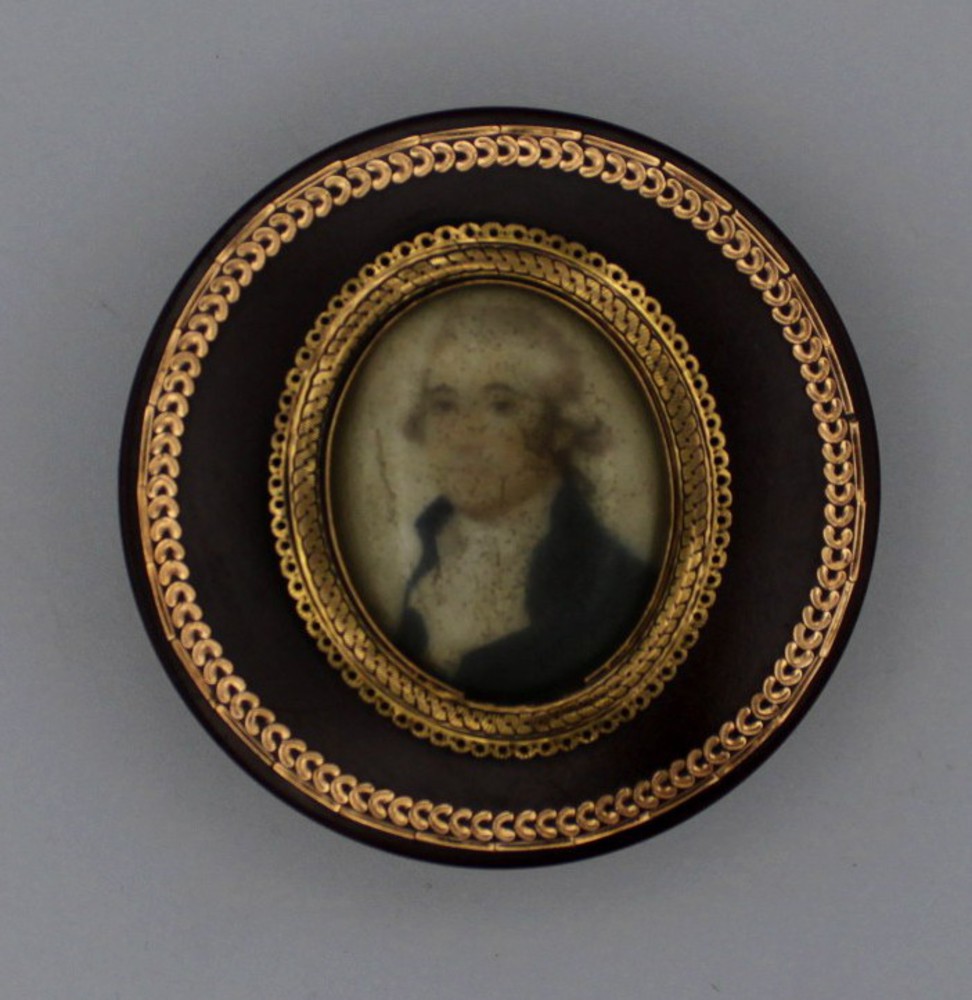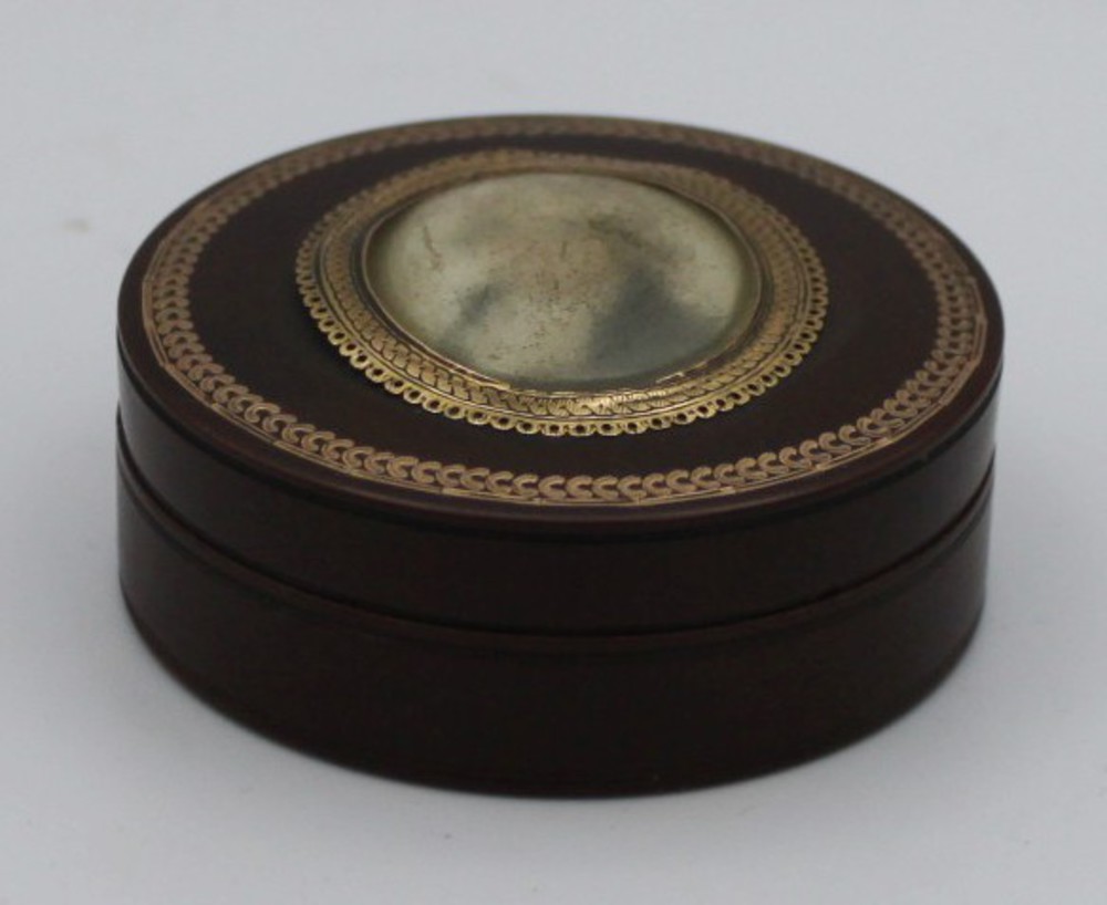 TABACCHIERA in legno di ulivo con finiture in bronzo e miniatura di gentiluomo al coperchio. Inizio XIX sec. cm 6