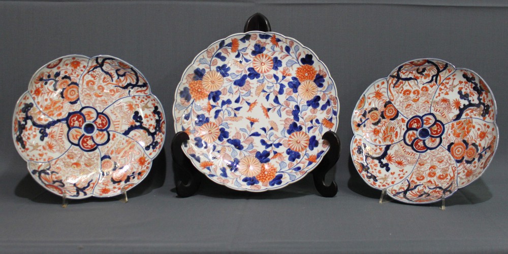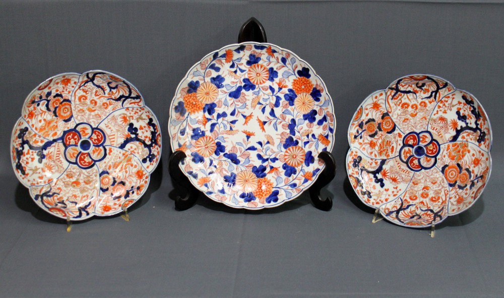 TRE PIATTI da parata in porcellana Imari. Giappone periodo Meiji Misure varie