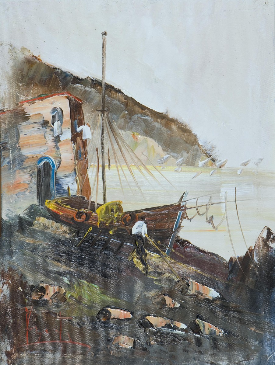M.ARGENTO Pescatori. Olio su tela. Cm 32x42. Firmato in basso a sinistra