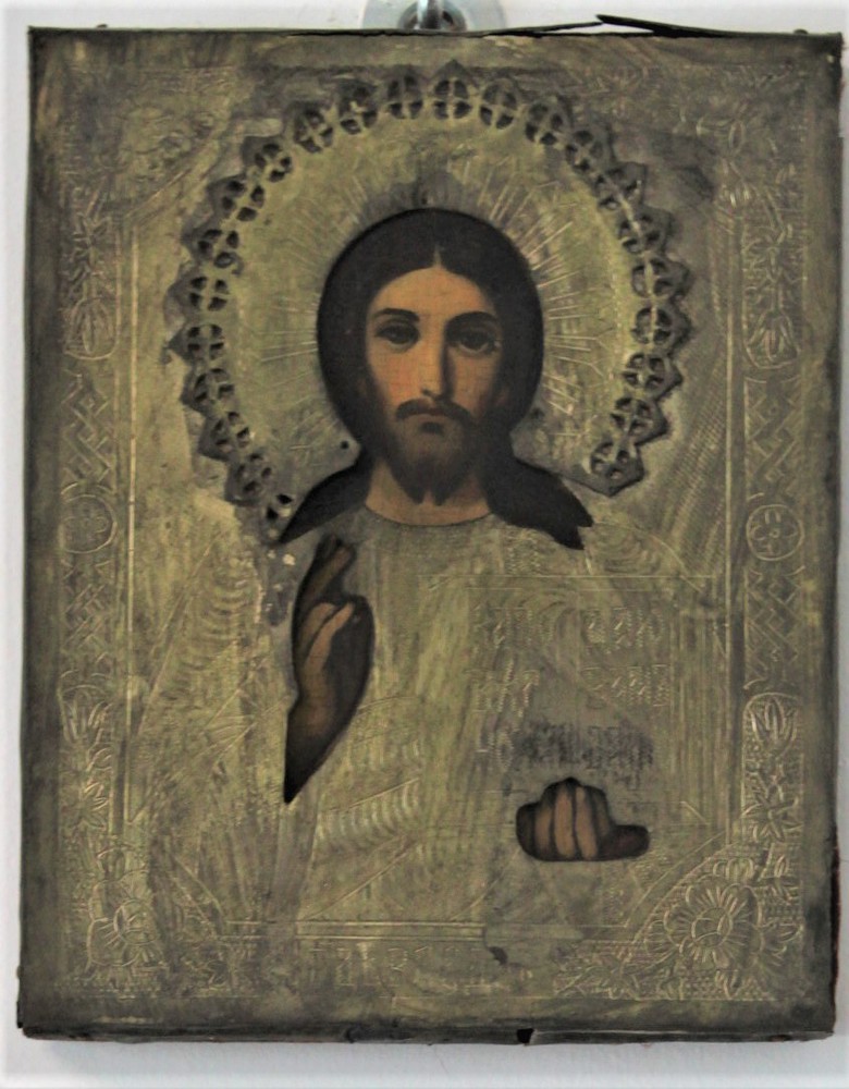 ARTISTA RUSSO DEL XIX/XX SEC. "Cristo Pantokrator" Tempera su tavola con riza in metallo cm 17x14