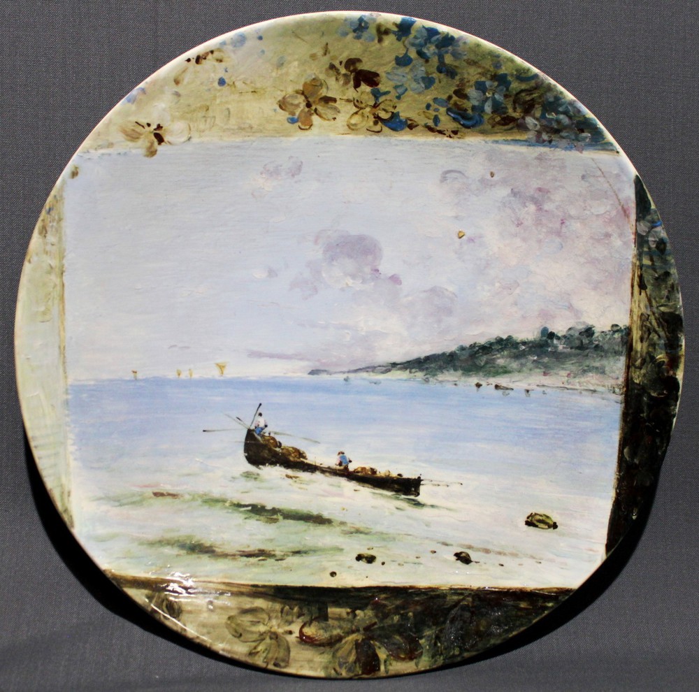 CESARE CACCIAPUOTI (1858 - 1914) "Marina" Piatto in teraglia policroma, marchio incusso, ispirata ai temi portati al successo da Edoardo Dalbono. Questa marina potrebbe attribuirsi ad Attilio Pratella che lavorò per questa manifattura, realizandone le parti dipinte, così come per le realizzazioni scultoree. cm 32