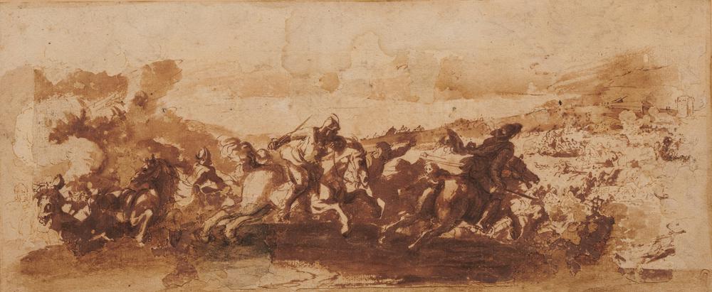 Guillaume Courtois [attribuito a] (1628 - 1679) SCENA DI BATTAGLIA Penna e inchiostro bruno. mm 139x334. Provenienza: Collezione Francis Abbott (Lugt, 970. Timbro al verso)