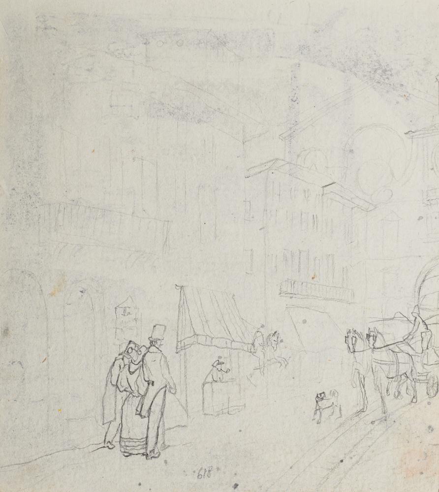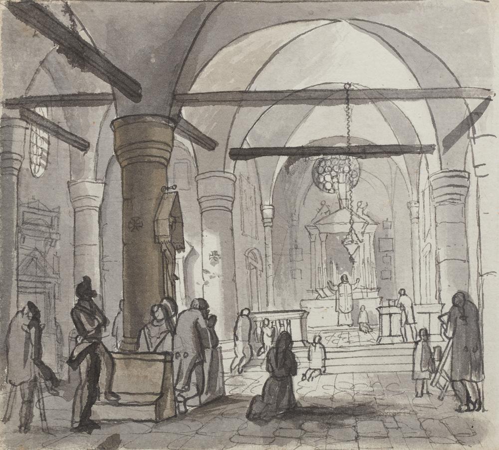 Scuola Lombarda del XIX secolo INTERNO DI CHIESA Penna e inchiostro nero e matita di grafite. mm 175x195. Al verso: Scena di vita lungo una via. Matita di grafite.