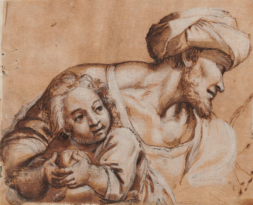 Scuola Emiliana del XVII secolo UOMO CON TURBANTE E FANCIULLO Penna e inchiostro bruno e tempera bianca. mm 111x140.