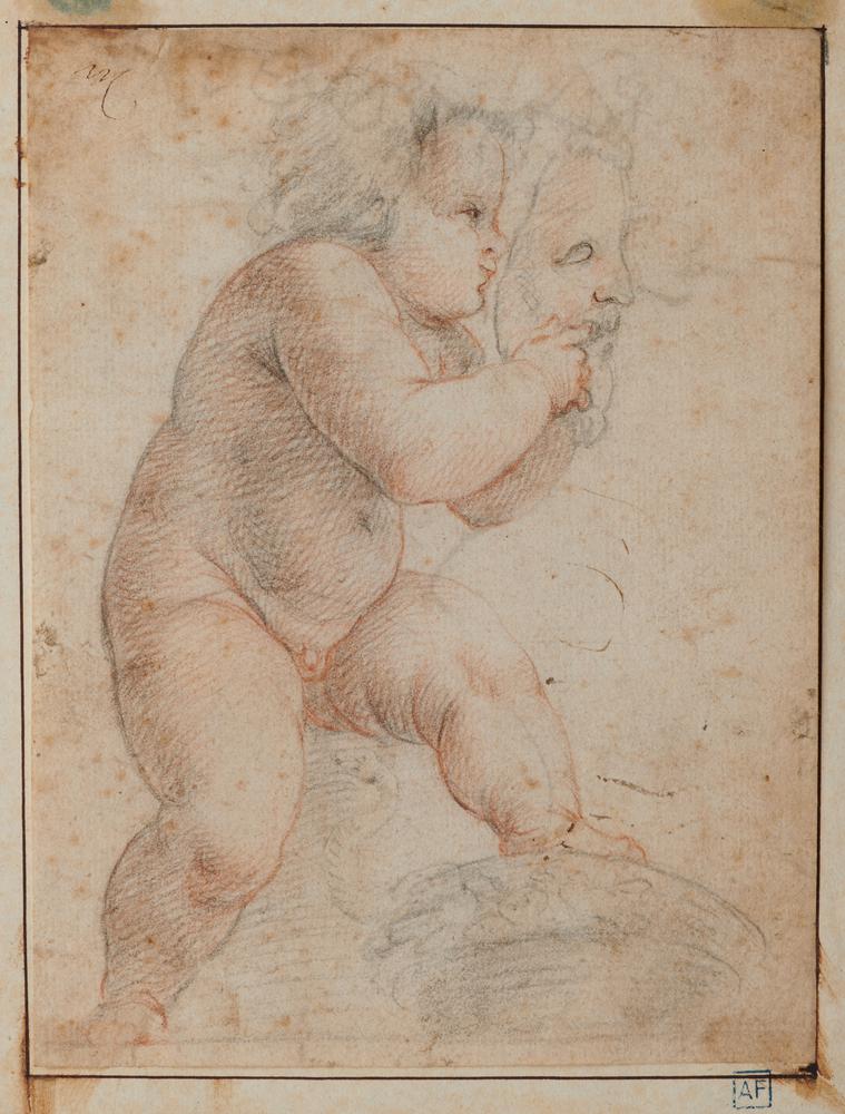 Scuola Romana del XVII secolo PUTTO CON MASCHERA Matita rossa e matita di grafite. mm 154x116. Provenienza: Collezione Ferruccio Asta (Lugt, 116a. Timbro al recto)