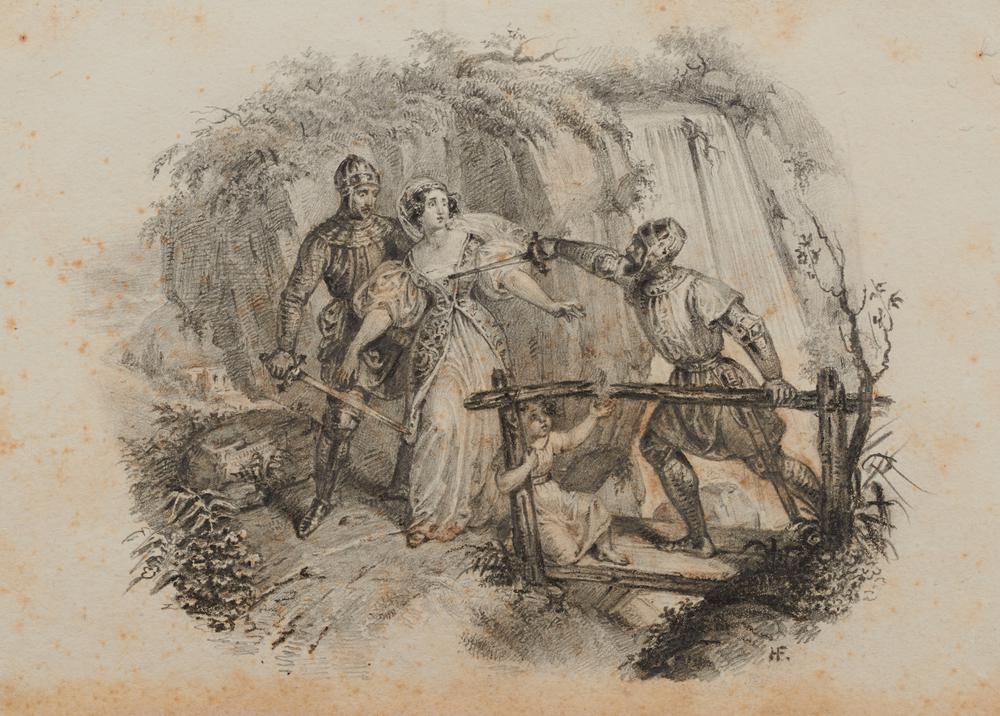 Francesco Hayez [scuola di] (1791 - 1882) UNA DAMA FRA DUE DUELLANTI Matita di grafite. mm 128x175. Reca monogramma 'HF' in basso a destra.