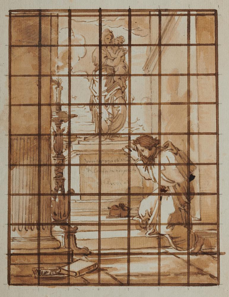Enrico Scuri (1805 - 1884) SACERDOTE IN PREGHIERA DAVANTI ALLA STATUA DELLA VERGINE Penna e inchiostro bruno. mm 202x143.