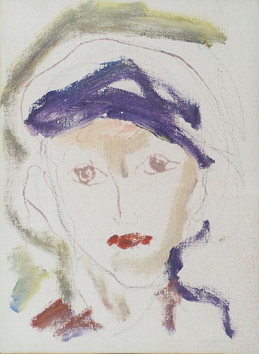 Ernesto Treccani 1929-2009 "Volto con cappello" cm. 19x14 - olio su tela Firmato b. a d.