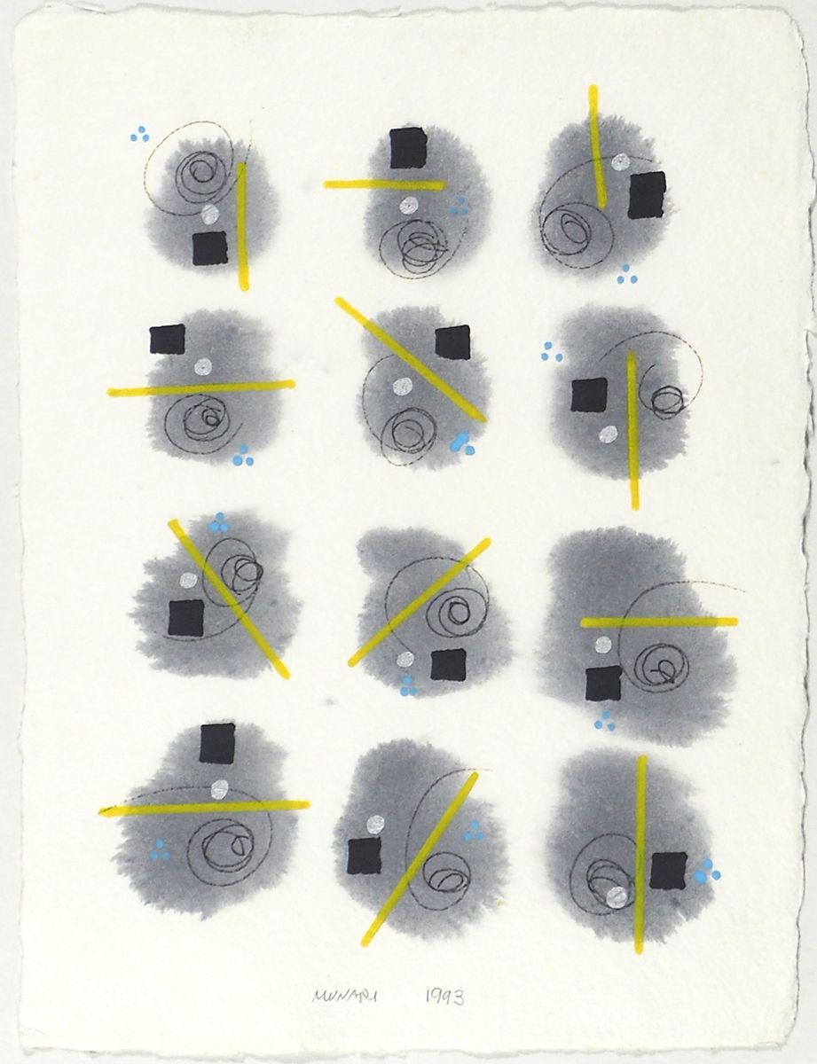 Bruno Munari 1907-1998 "Prove geometriche" cm. 32x25 - tecnica mista su carta Firmato b. al centro e datato 1993. Opera esposta al Civico Museo Revoltella di Trieste nell'ambito della manifestazione "Revoltella Estate", luglio-agosto 1994, come da etichetta al retro.