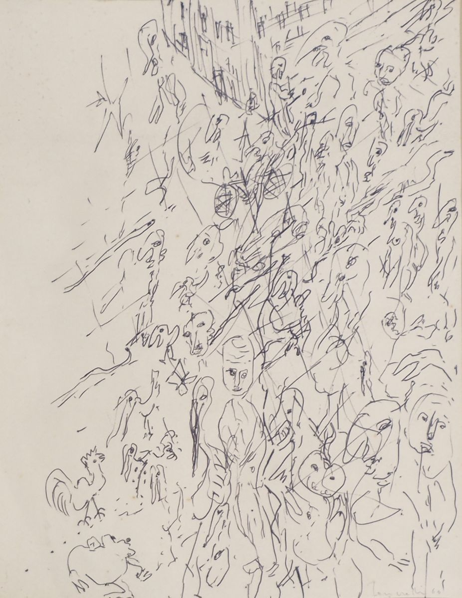 Tancredi Parmeggiani 1927-1964 "Personaggi e animali" cm. 27x21 - penna su carta Firmato b. a d. e datato '60 Al retro timbro etichetta Galleria d'arte Il Canale. Al retro sul cartone protettivo timbro Studio d'arte G.R. Sacile.