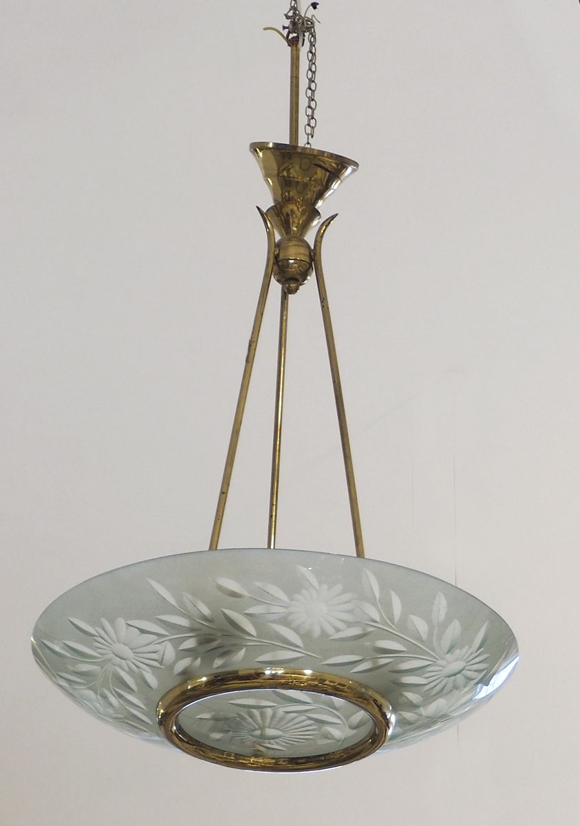 Lotto 57 | Lampadario in vetro satinato e ottone. Anni '50. H. cm. 88.