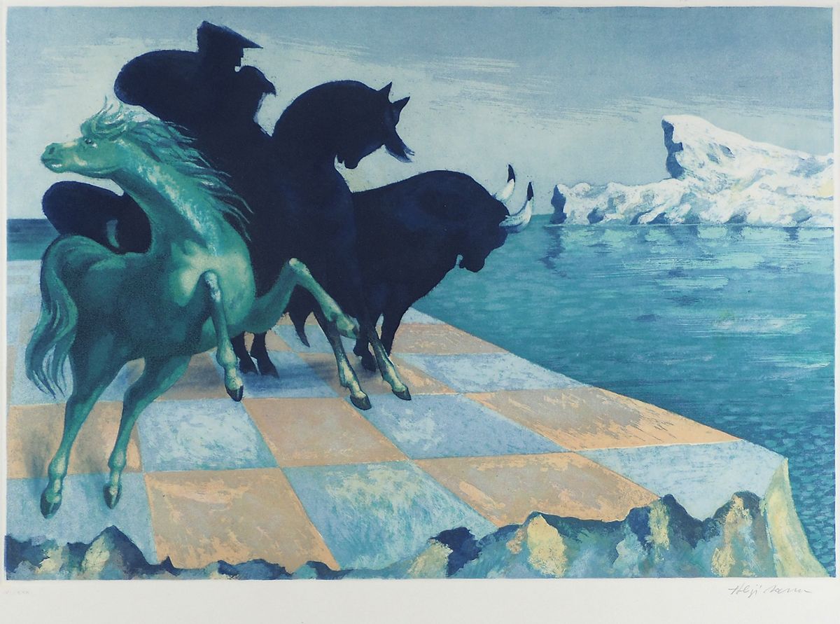 Aligi Sassu Milano 1912-2000 "Cavalli e toro" cm. 70x85 - litografia a colori Firmato b. a d. Esemplare VI/XXX.
