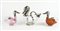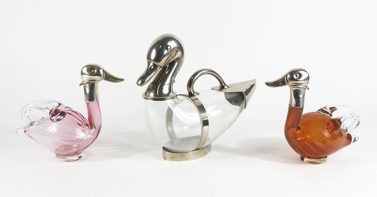 Lotto di 3 bottiglie in vetro e argento a forma di papere. Lung. max cm. 34.