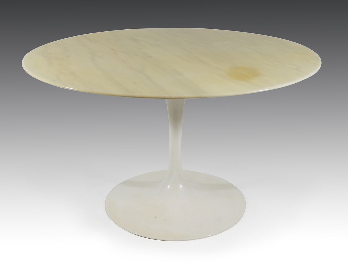 Knoll: tavolo rotondo con base in metallo laccato bianco e piano in marmo arabescato. Disegno di E. Saarinen, 1956. H. cm. 73, diam. cm. 120.