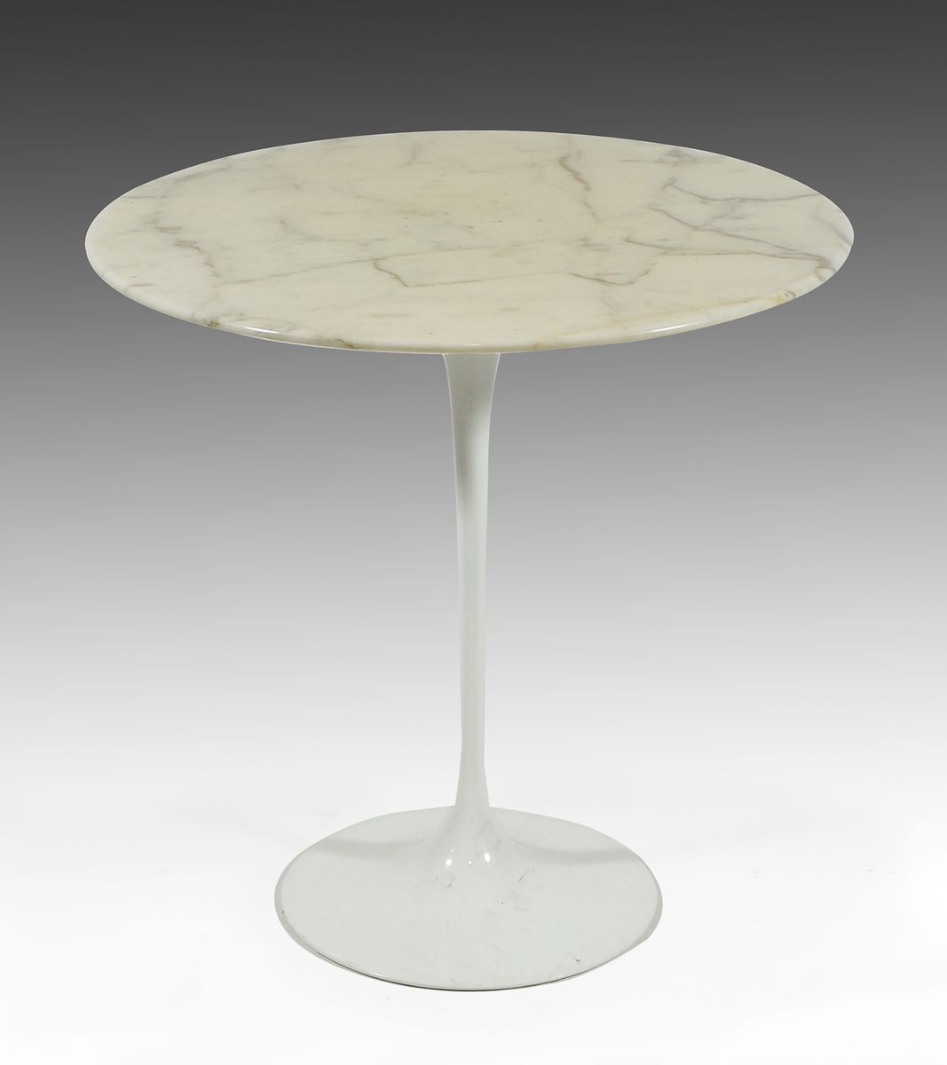 Knoll: tavolino in metallo laccato bianco con piano in marmo. Disegno di E. Saarinen, 1956. Firmato sotto la base. H. cm. 51, diam. cm. 51.