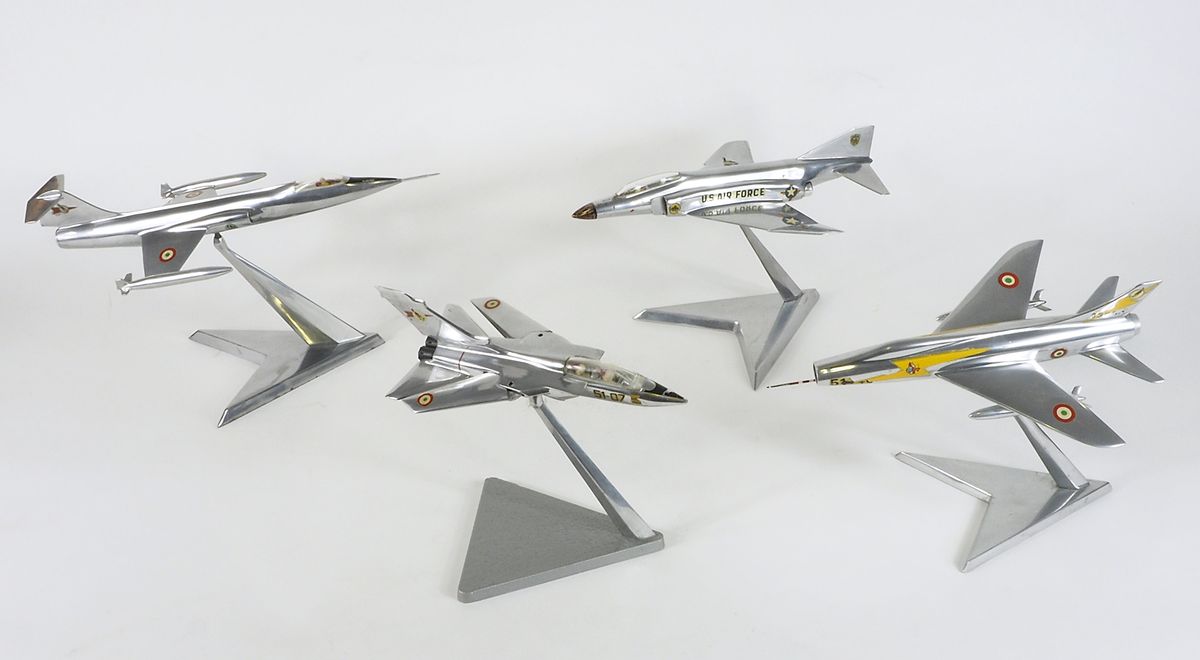Lotto di 4 modellini di aerei in acciaio con supporto snodabile. Anni '70.