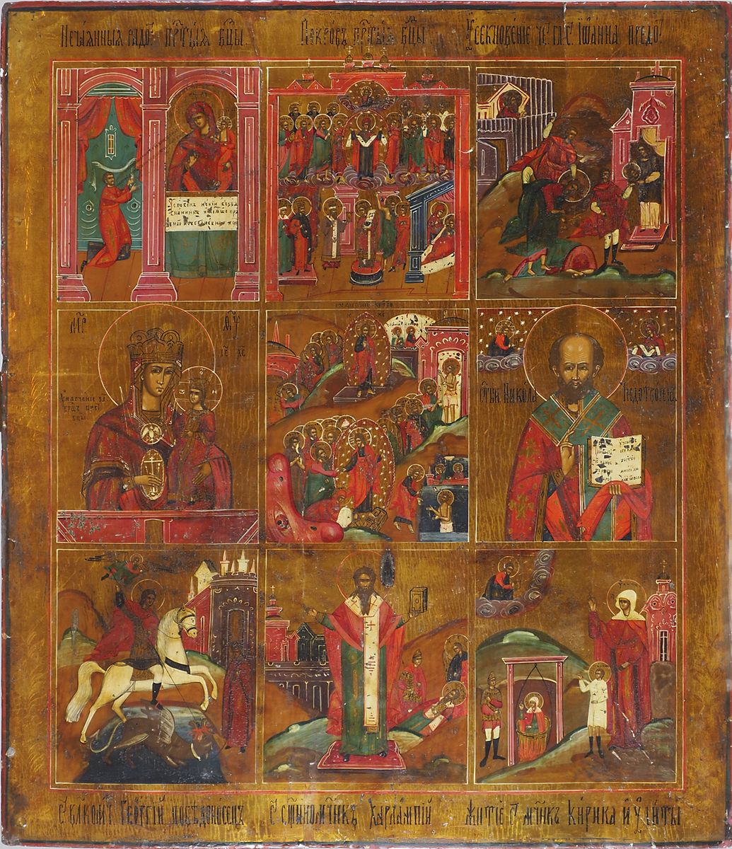 Icona dipinta su tavola raffigurante 9 parti con discesa e Resurrezione. Russia, XIX secolo. cm. 71x61.