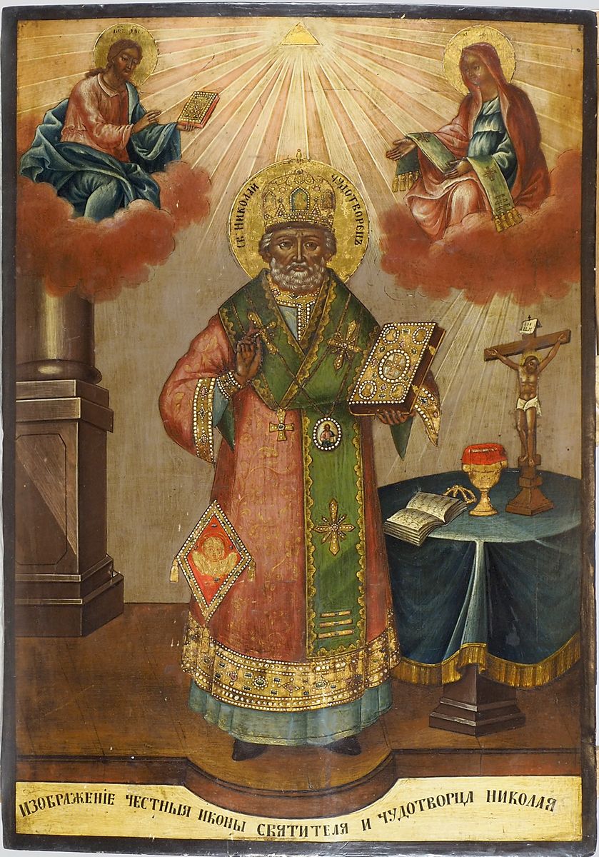 Icona dipinta su tavola raffigurante San Nicola. Russia centrale, fine XVIII secolo. cm. 50x35.