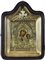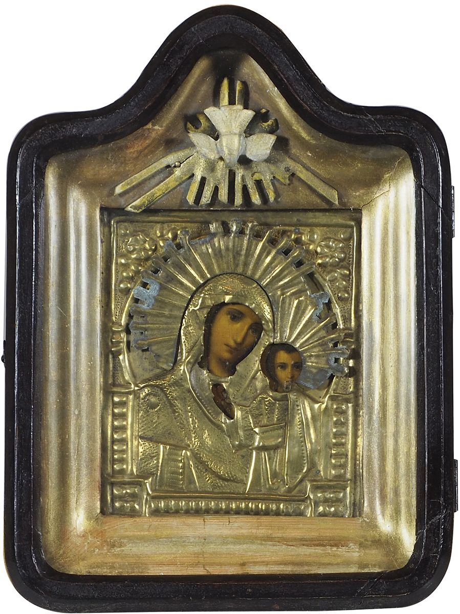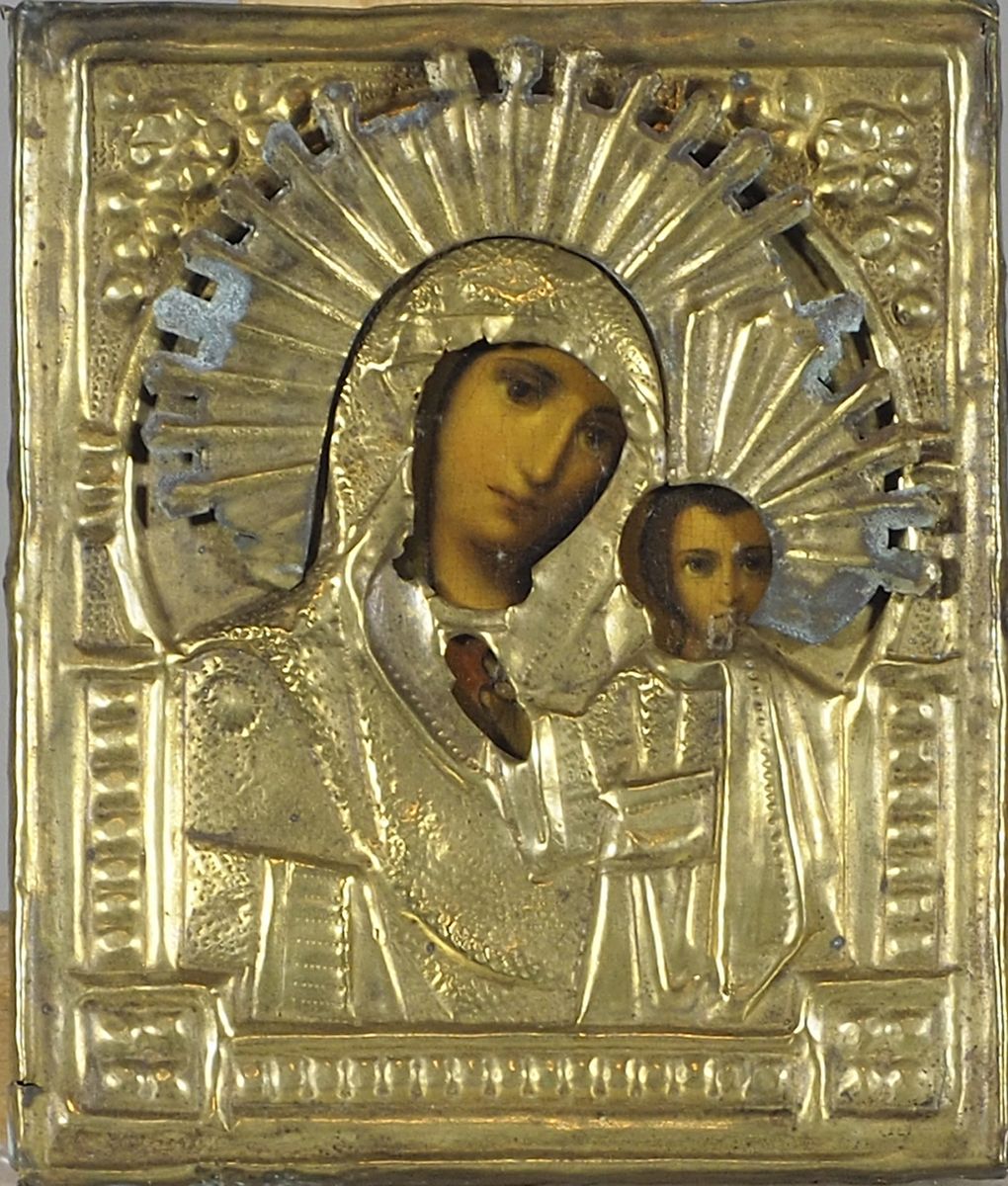Icona dipinta su tavola raffigurante Madre di Dio di Kazan con riza in metallo dorato. Entro teca in legno e vetro. Russia centrale, XIX secolo. cm. tot 24x18 (20x15).