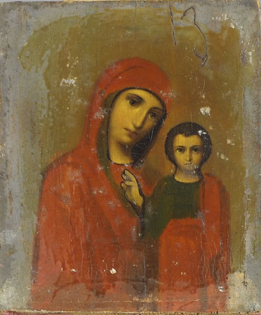 Lotto 171 | Icona dipinta su tavola raffigurante Madre di Dio di Kazan con riza in...