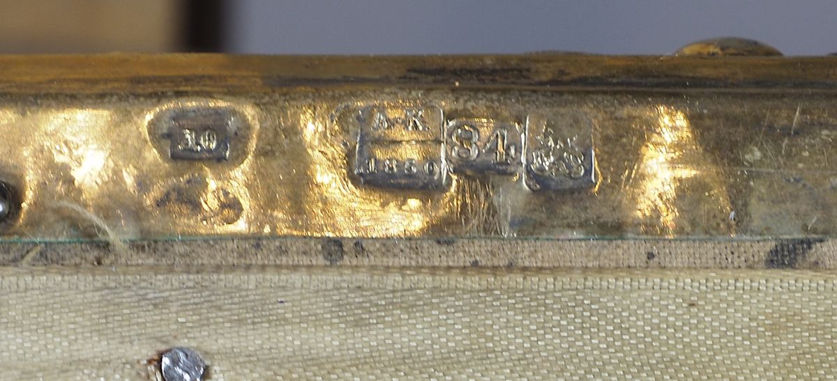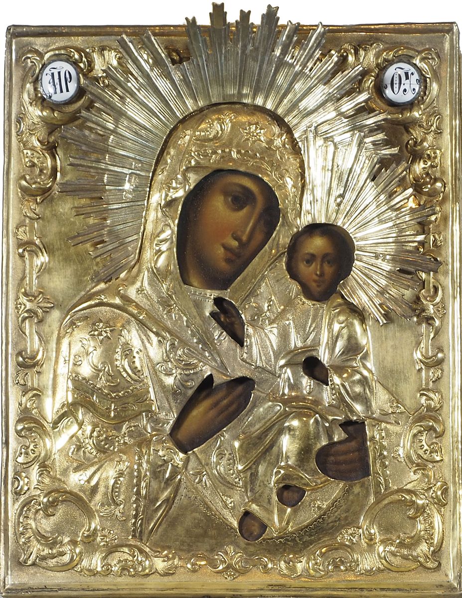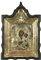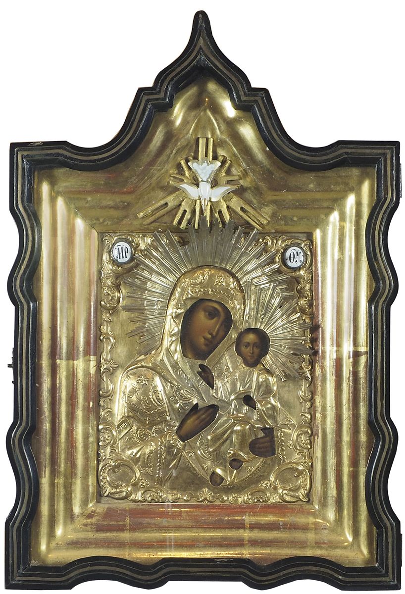 Icona dipinta su tavola raffigurante Madre di Dio di Smotlensk con riza in argento dorato e smalti. Entro teca in legno e vetro. Russia, XIX secolo. cm. tot 44x30 (31x27).