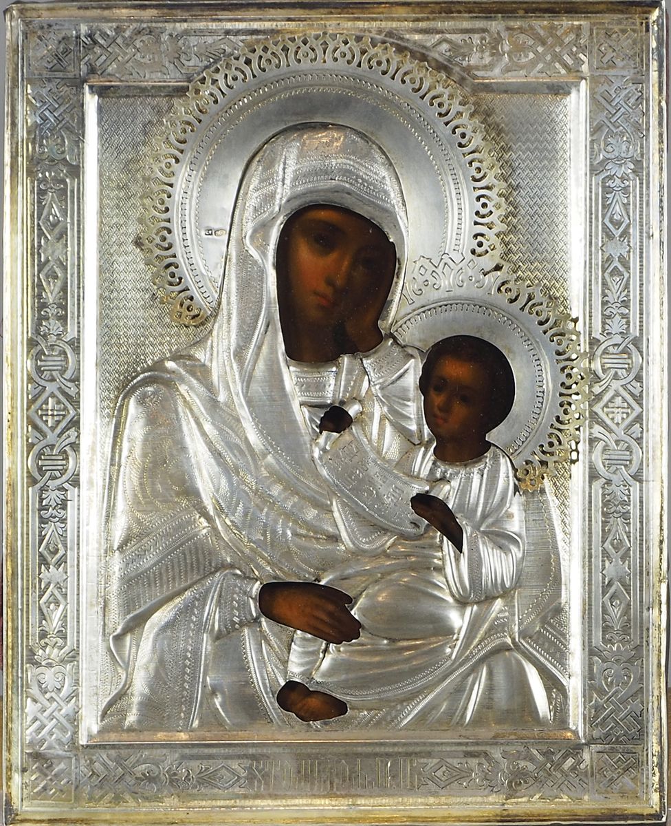 Icona dipinta su tavola raffigurante Madre di Dio di "Lenisci i miei dolori". Russia, XIX secolo. cm. tot 37x27 (34x24(.