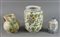 Lotto in maiolica a smalti policromi composto da brocca con manico e due vasi. H. max cm. 25.