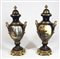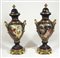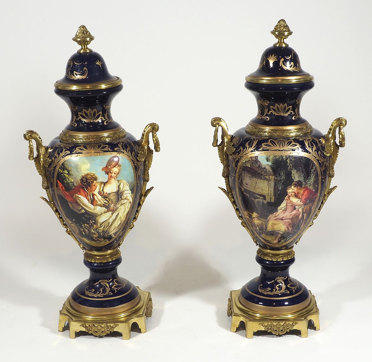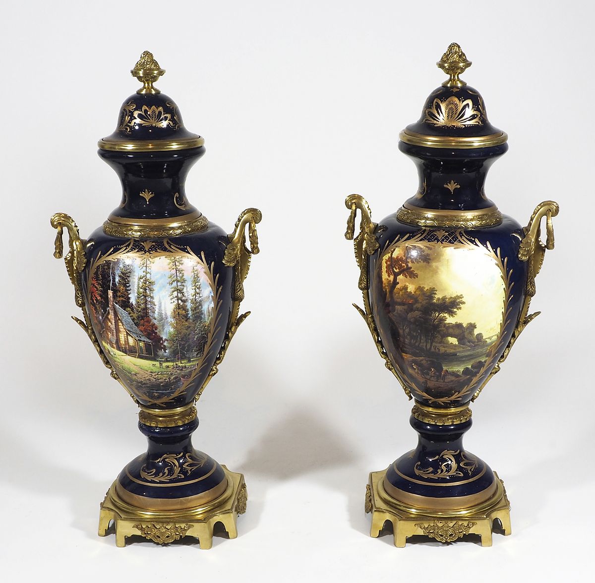 Coppia di grandi vasi in porcellana blu con decori policromi e dorati e applicazioni in metallo dorato. H. cm. 98.