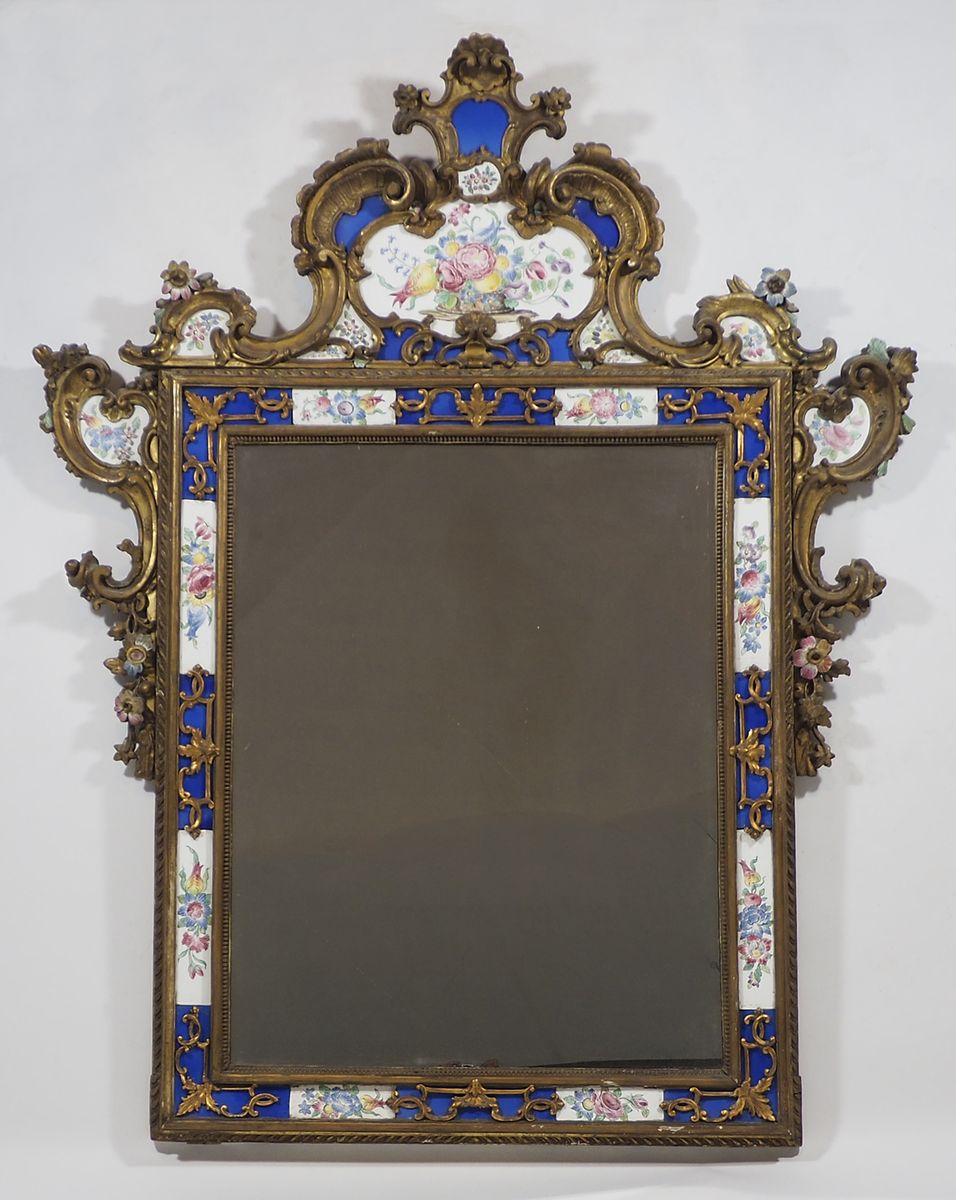 Grande specchiera rettangolare con cornice e cimase in legno dorato scolpito con applicazion di piastre in maiolica policroma decorate a motivi floreali. Veneto, XIX secolo. cm. 161x113.