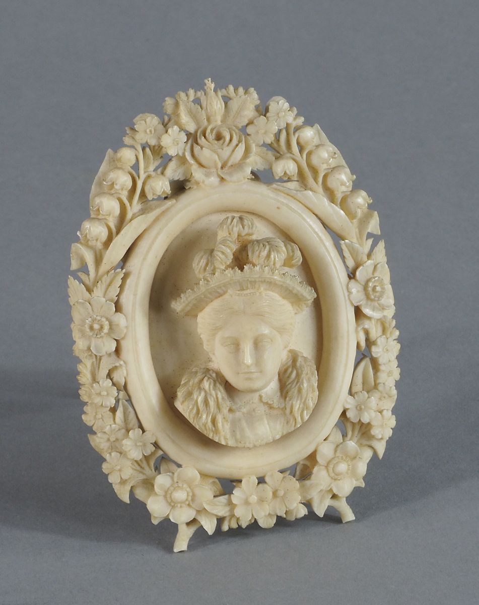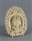 Piccola cornice portafoto da tavolo in avorio finemente lavorato a motivi floreali contenente volto di Elisabetta I. Metà XIX secolo. H. cm. 8.