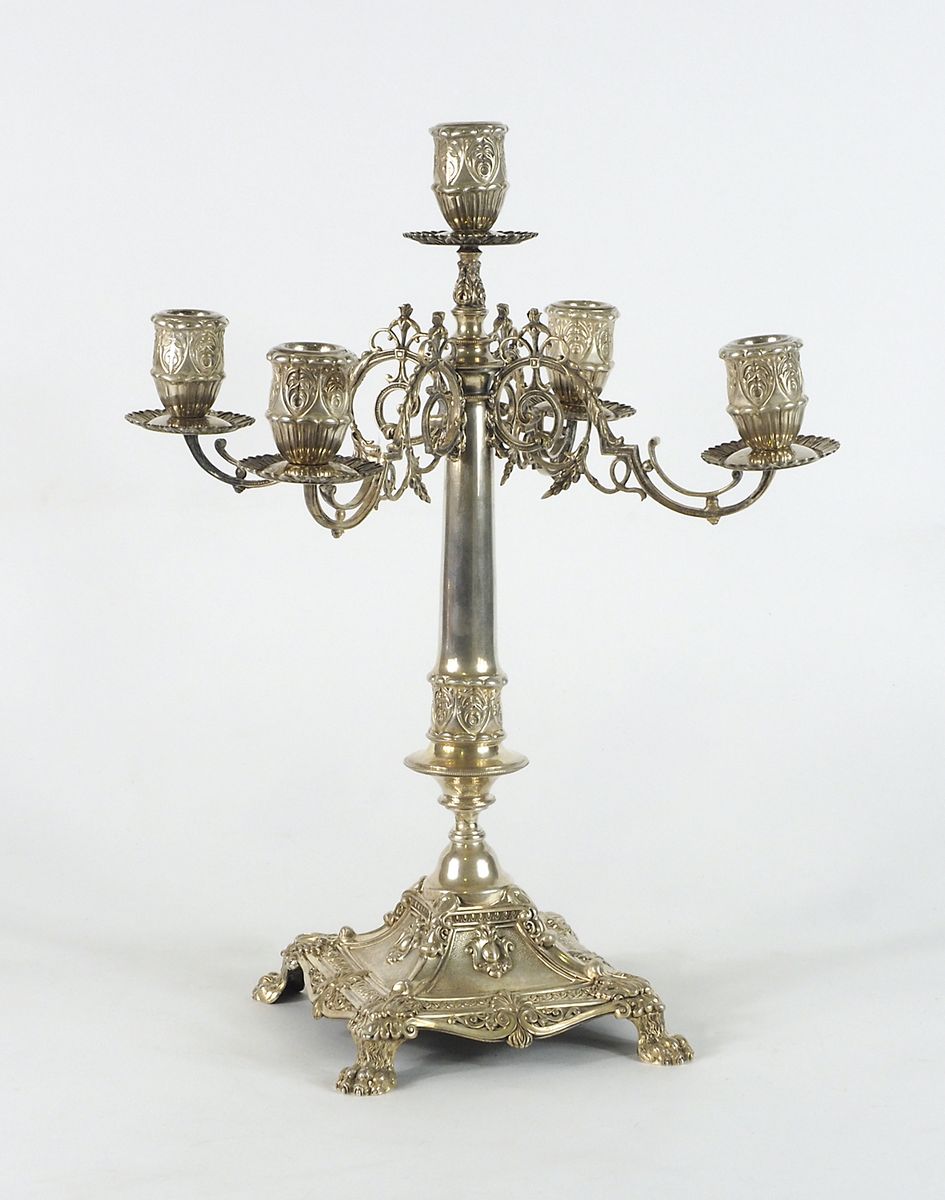 Candelabro in argento a 5 fiamme, su zampe ferine. H. cm. 43. gr. 1370.
