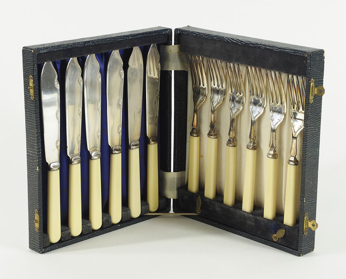 Teca contenente set di posate per 6 persone composta da 12 pezzi, manici in bachelite.