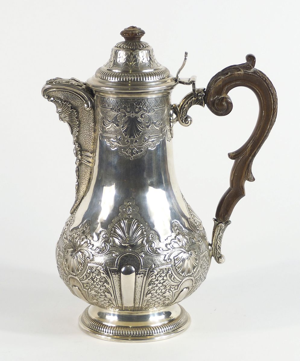Grande caffettiera in argento finemente sbalzata a decoro di conchiglie e...