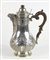 Grande caffettiera in argento finemente sbalzata a decoro di conchiglie e volute, manico in legno. Non punzonata. gr. 1000. H. cm. 28.
