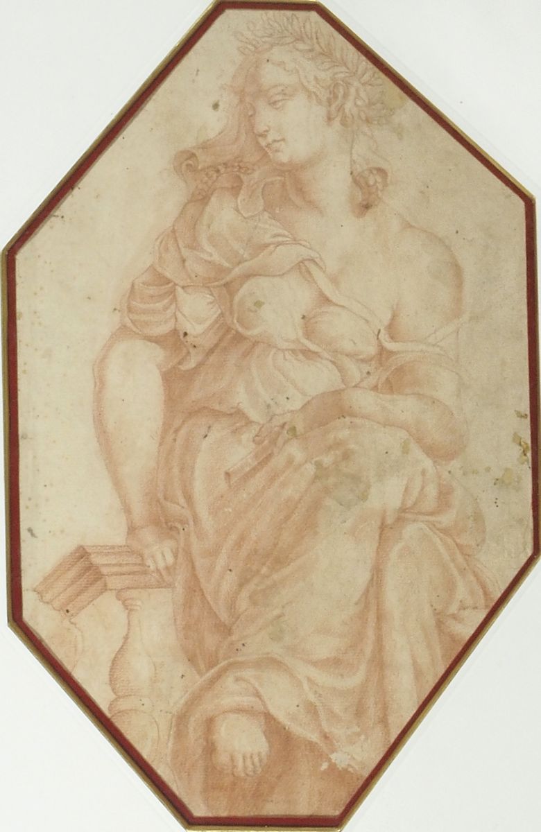 Maestro del XVII secolo "Figura allegorica" cm. 34x22 - sanguigna su carta Al retro vecchia etichetta del Prof. Franz Kieslinger che attribuisce l'opera a Francesco Salviati.
