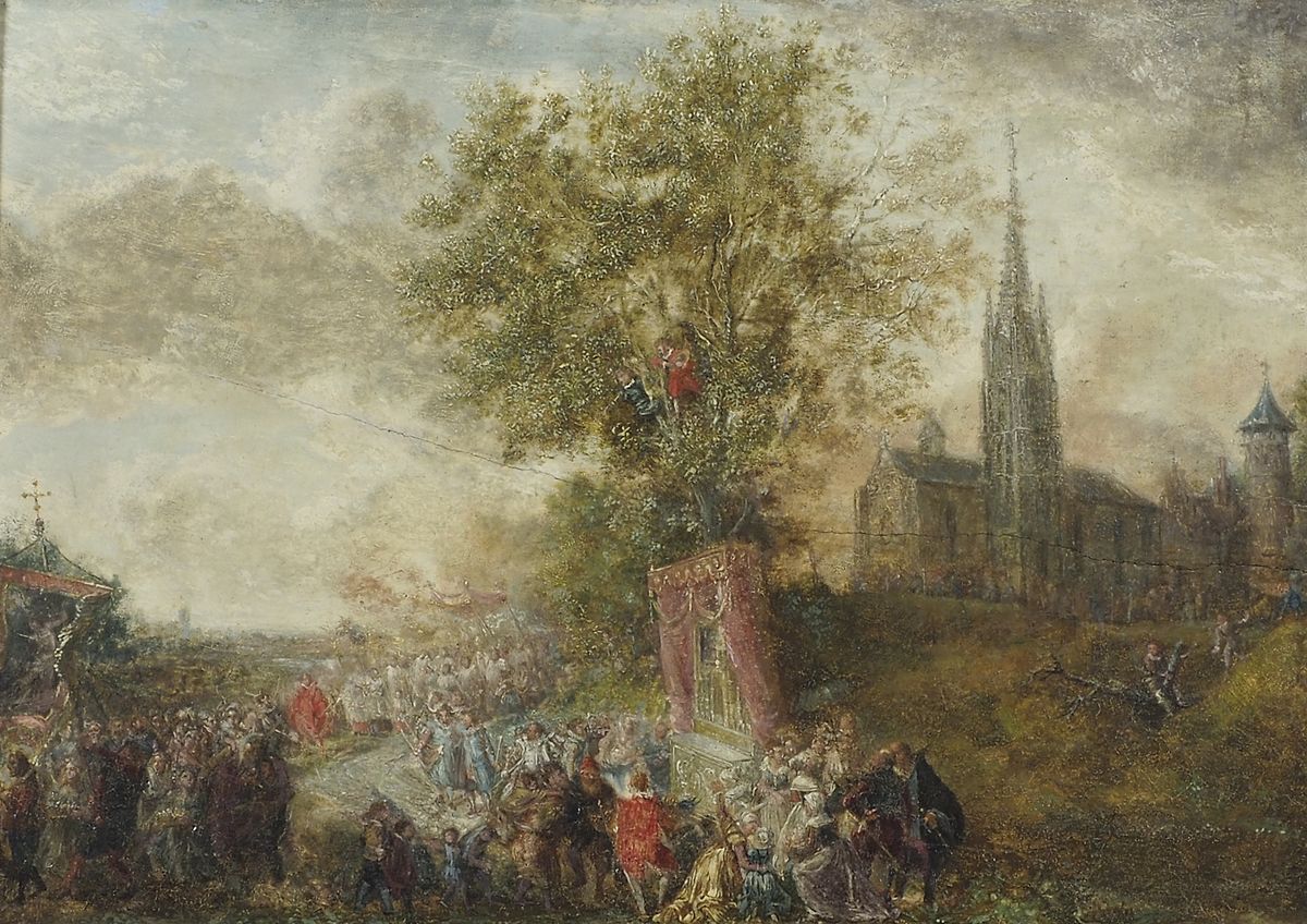 Maestro nordico fine XVIII secolo "Scena con processione" cm. 32x42 - olio su tavola