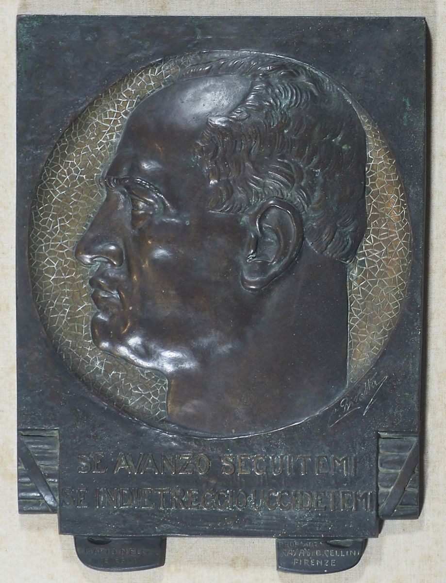 Carlo Rivalta 1887-1941 Piastra in bronzo a patina verde raffigurante profilo del Duce, cm. 44x33. Firma incisa.