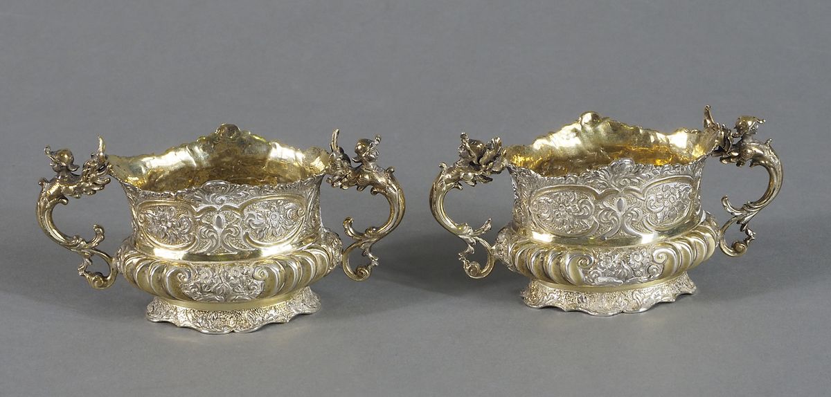 Coppia di salierine in argento 925 dorato con mainci sagomati con teste,...