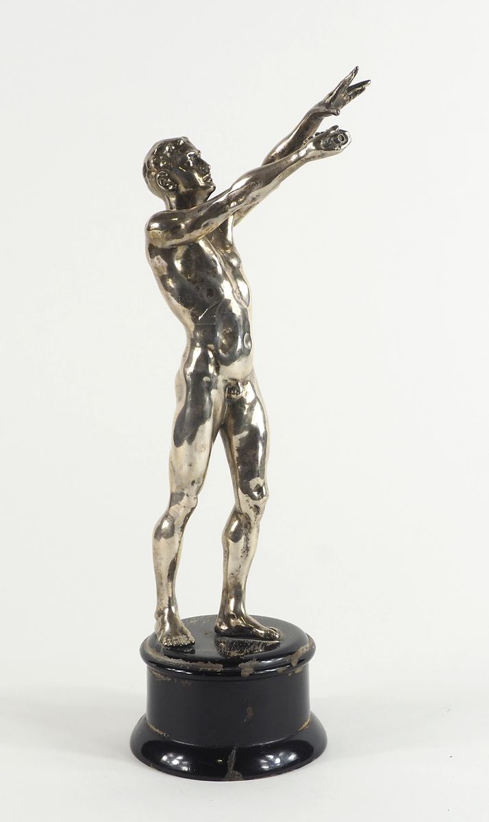 Scultura in argento raffigurante figura maschile con spada, base in legno. H....