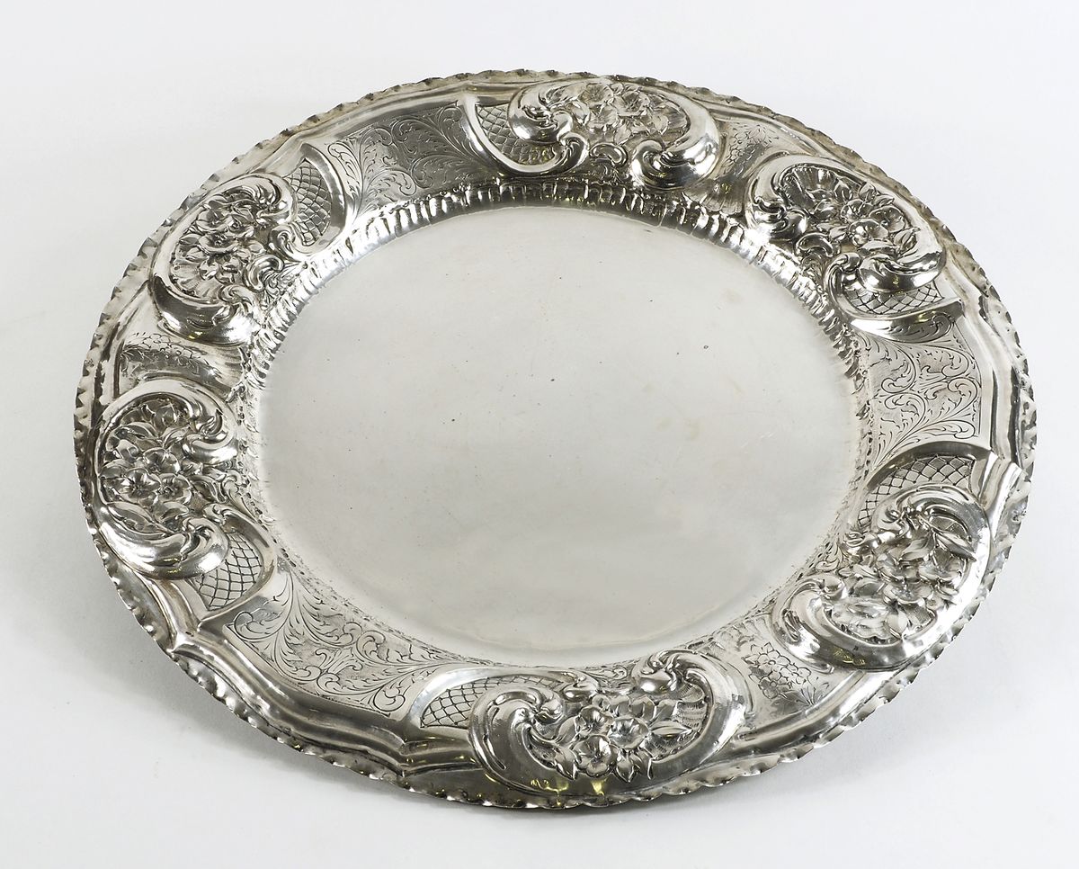 Grande piatto in argento con bordo riccamente sbalzato. Diam. cm. 50. gr. 1380.