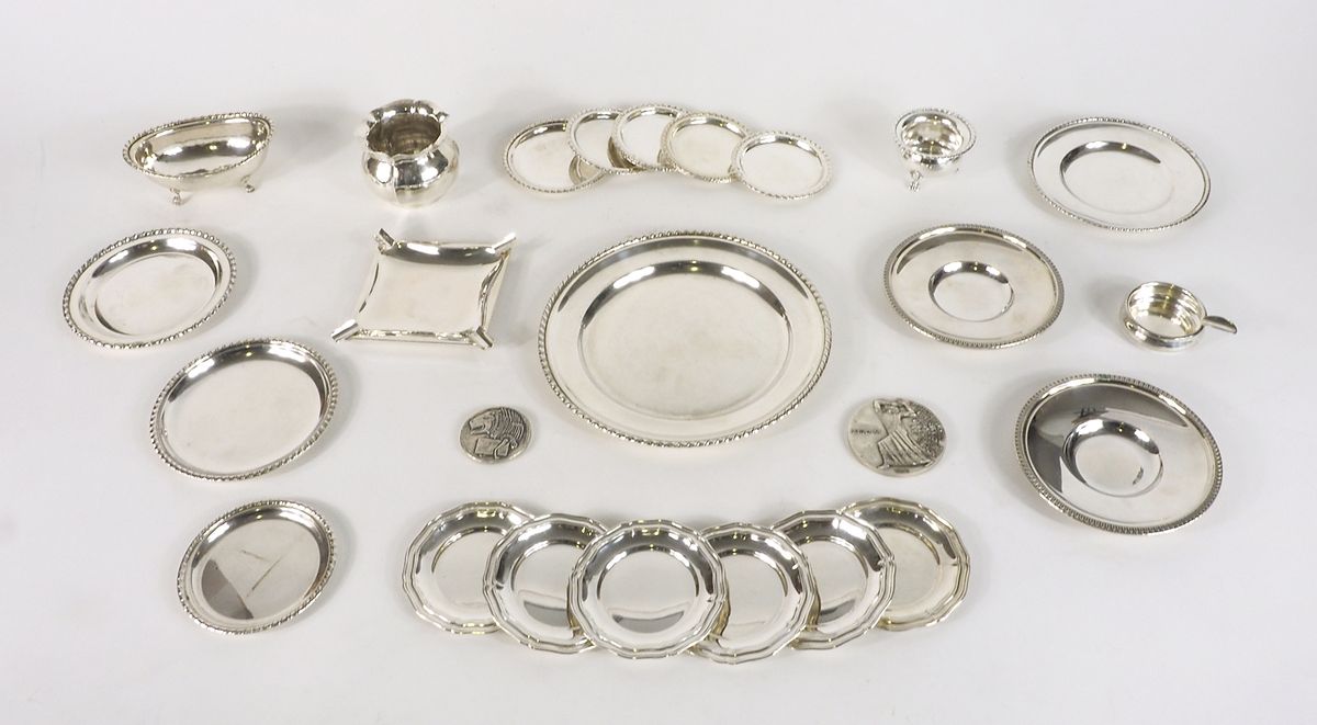 Lotto di vari oggetti in argento tra cui medaglie e piattini. gr. tot 1270.