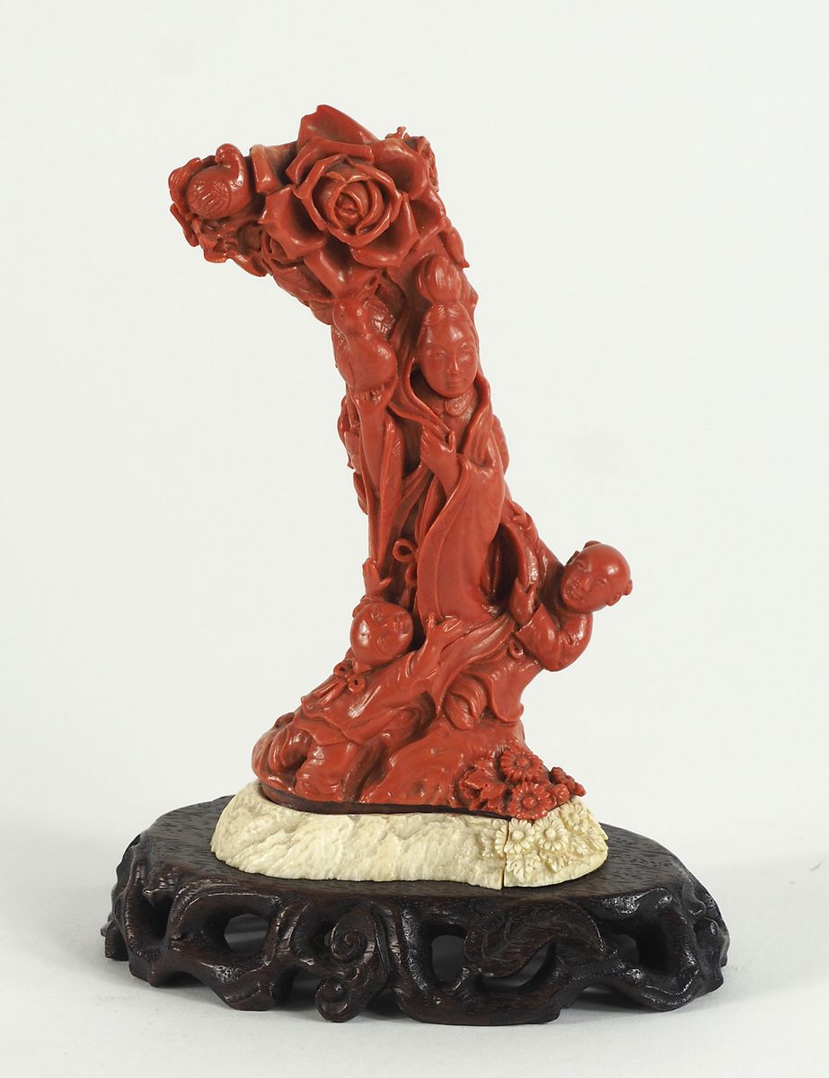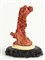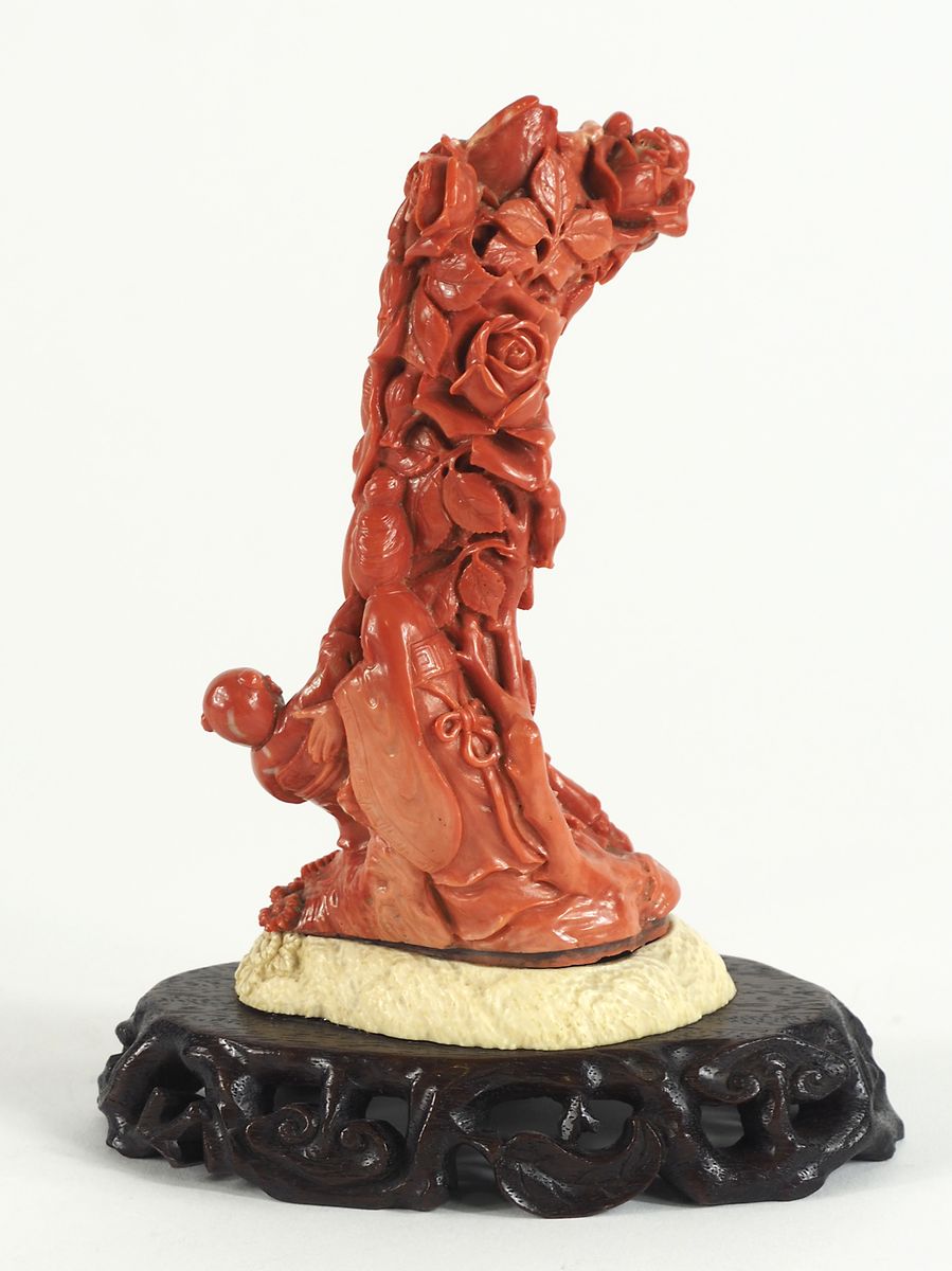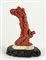 Scultura in corallo lavorato raffigurante albero, base in legno. H. tot cm. 17.