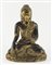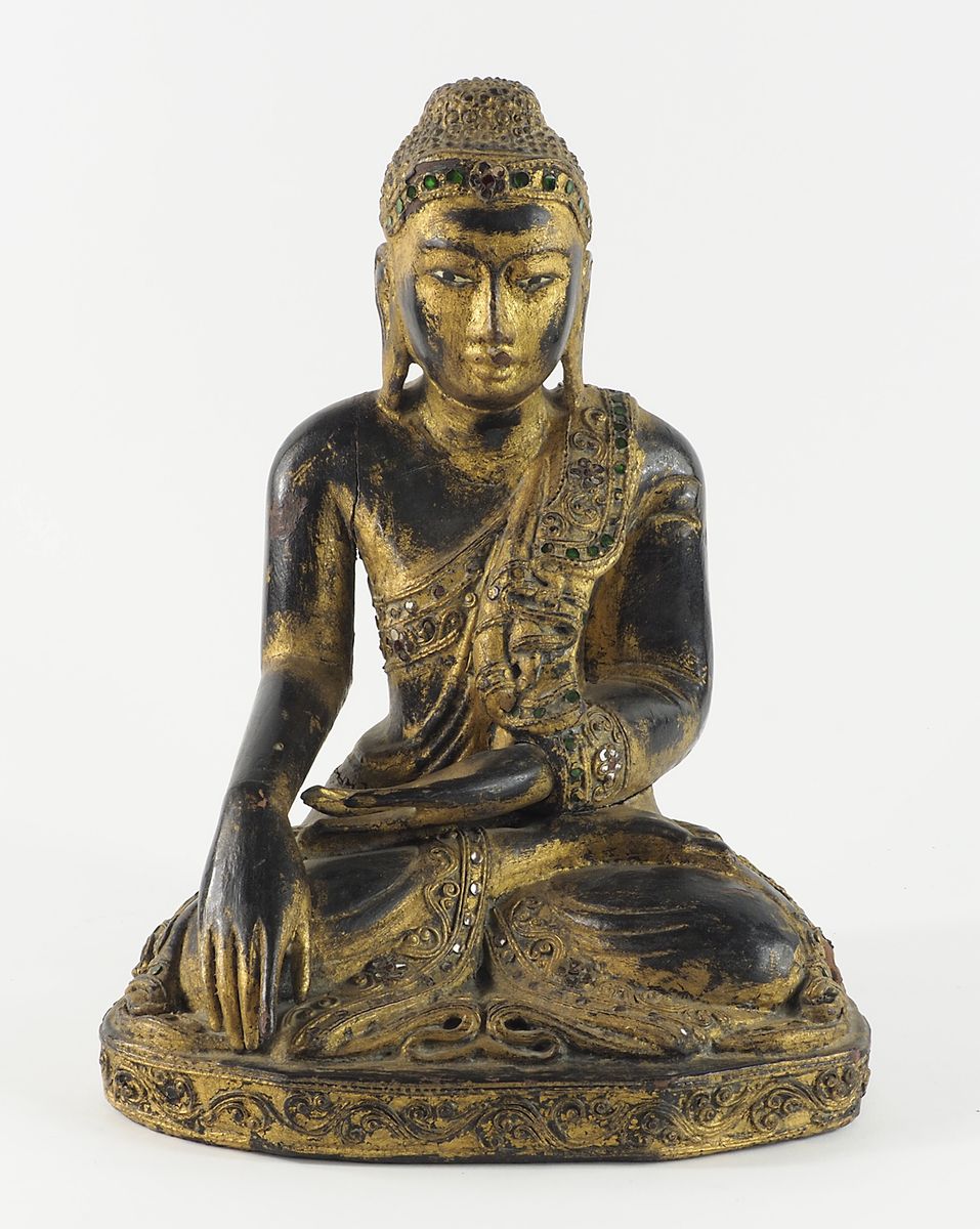 Scultura in legno nero e legno dorato con applicazioni di vetri policromi raffigurante Buddha seduto. H. cm. 34.