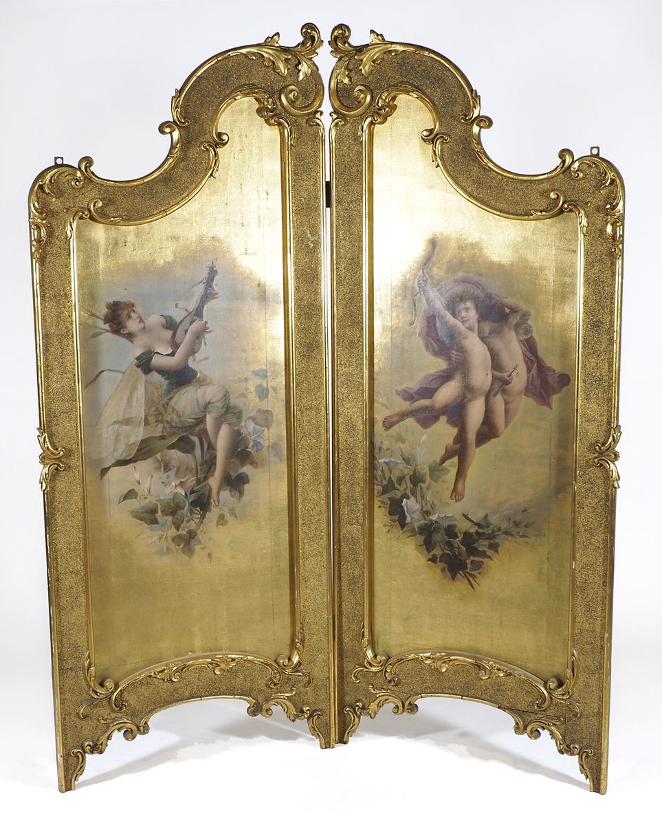 Paravento a 2 ante con bordi in legno dorato finemente scolpito, all'interno tele raffiguranti putti e suonatrice. XIX secolo. cm. 177x70 (chiuso).