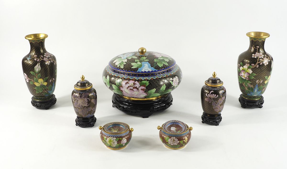 Lotto di vari oggetti cloisonnè tra cui scatola e vasetti.