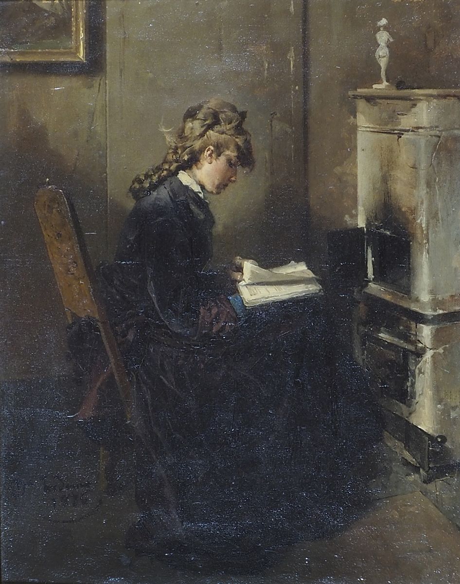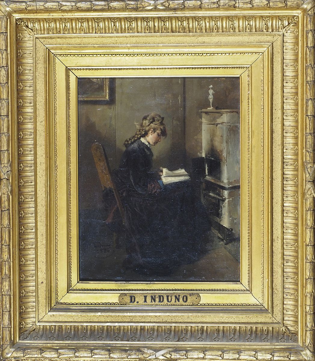 Domenico Induno 1815-1878 "Al caldo della stufa" cm. 35x27 - olio su tela Firmato b. a s. e datato 1876. Prov.: importante famiglia triestina.