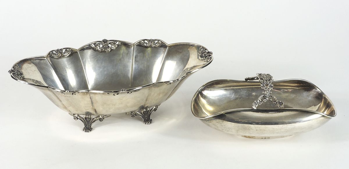 Lotto di 2 cestini ovali in argento. gr. 800.