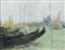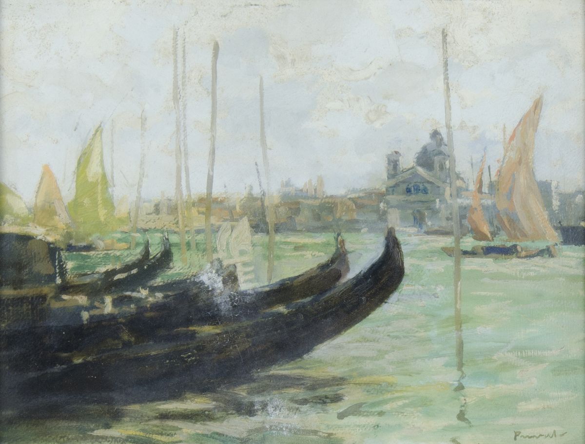 Cosimo Privato 1889-1971 "Gondole all'ormeggio" cm. 30x40 - olio su cartone Firmato b. a d. Al retro etichetta Mostra personale dell'Artista, Galleria Bordin Padova 1948.