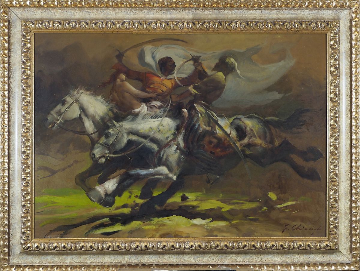 Giuseppe Chiacigh Wladikawkaz 1895-Trieste 1967 "Duello a cavallo" cm. 70x100...