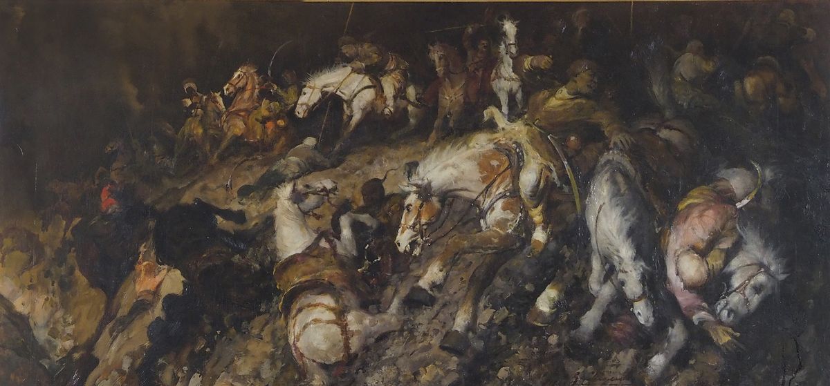 Giuseppe Chiacigh Wladikawkaz 1895-Trieste 1967 "Battaglia nella notte" cm. 60x125 - olio su tavola Firmato b. a d.